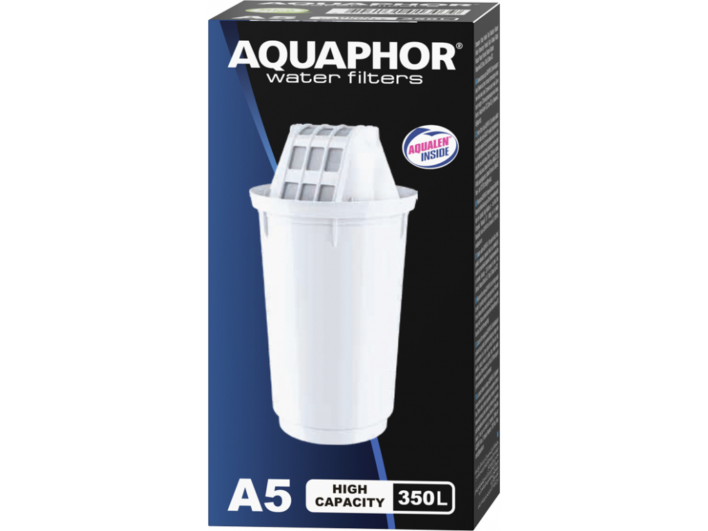 Filtr Aquaphor A5 nabízí dlouhodobější ochranu před kontaminanty v kohoutkové vodě. Obsahuje více sorbentu pro prodlouženou životnost filtru na 350 litrů. Snižuje nepříjemnou chuť a redukuje zápach chlóru, filtruje usazeniny pro čistší a jasnější vodu a aktivně zabraňuje usazování vodního kamene. Účinně filtruje koloidní železo, těžké kovy (olovo apod.), organické sloučeniny, pesticidy a další nebezpečné látky, které se mohou objevit ve vodovodní vodě.