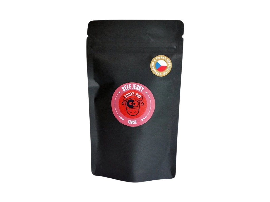 Jimmy’s Food Hovězí jerky Kimchi je sušené hovězí maso v kimchi marinádě, které kombinuje pevnější „jerky“ strukturu s chutí fermentované zeleniny, lehkou pálivostí a typickou vůní česneku a zázvoru. Maso se krájí na tenké plátky, ochutí marinádou a následně se pozvolna suší, aby si zachovalo výraznou chuť a dlouhou trvanlivost.