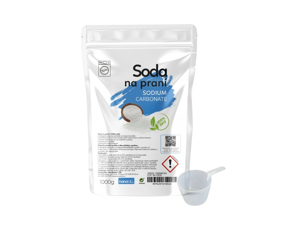 Soda na praní proniká do vláken tkaniny a efektivně odstraňuje nečistoty a skvrny. Její alkalické vlastnosti také neutralizují kyselé skvrny, jako je pot nebo víno.
