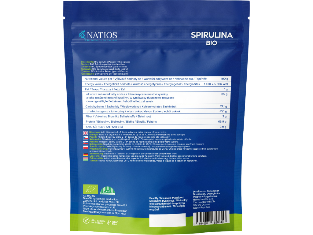 Každá porce obsahuje jemně mletý prášek ze sladkovodní řasy v BIO kvalitě. Díky tomu máte jistotu, že produkt neobsahuje zbytečné přísady a zachovává si svou čistotu. NATIOS Spirulina je spolehlivý základ, ke kterému se budete rádi vracet, ať už chcete podpořit svůj výkon, nebo jen držet výživu pod kontrolou.