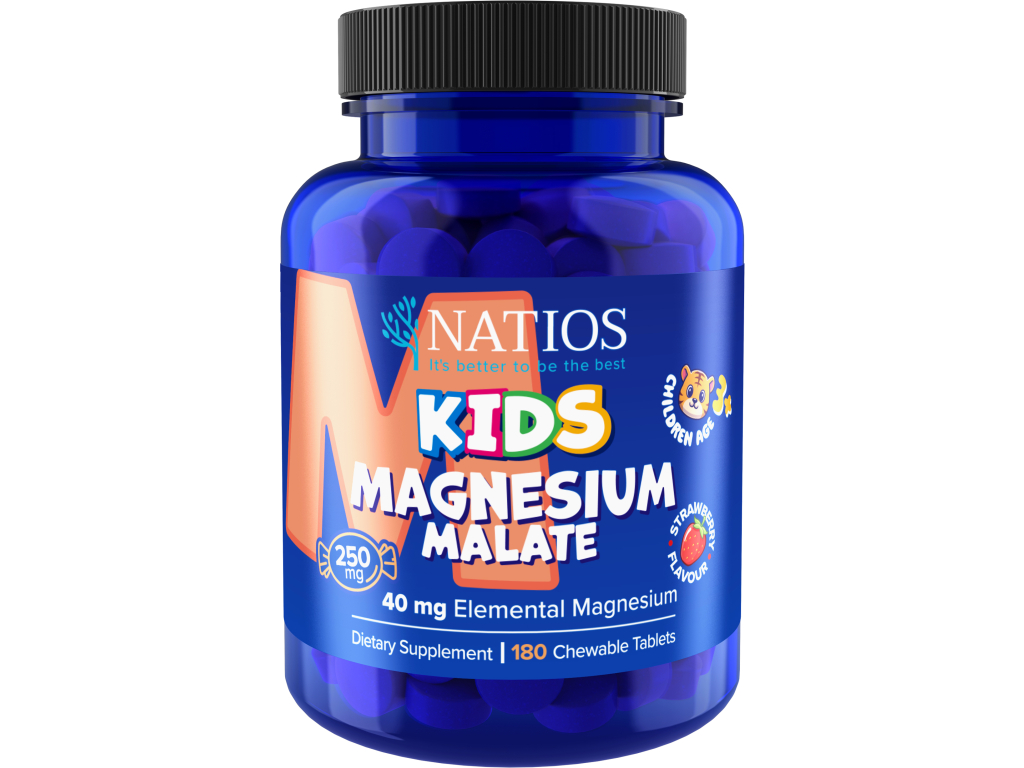 NATIOS Kids Magnesium Malate – lehce vstřebatelná forma hořčíku v chutných cucacích tabletkách s přírodní jahodovou příchutí. Vhodná pro děti od 3 let – ideální pro každodenní doplnění hořčíku hravou a příjemnou formou.