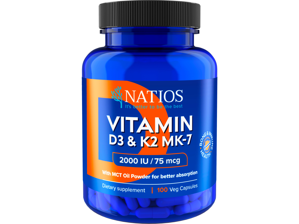 NATIOS Vitamin D3 + K2 – kombinace vysoce vstřebatelného vitamínu D3 a prémiové formy K2. Vitamin D přispívá k normálnímu vstřebávání vápníku a k normální funkci imunitního systému, vitamin K k udržení normálního stavu kostí.