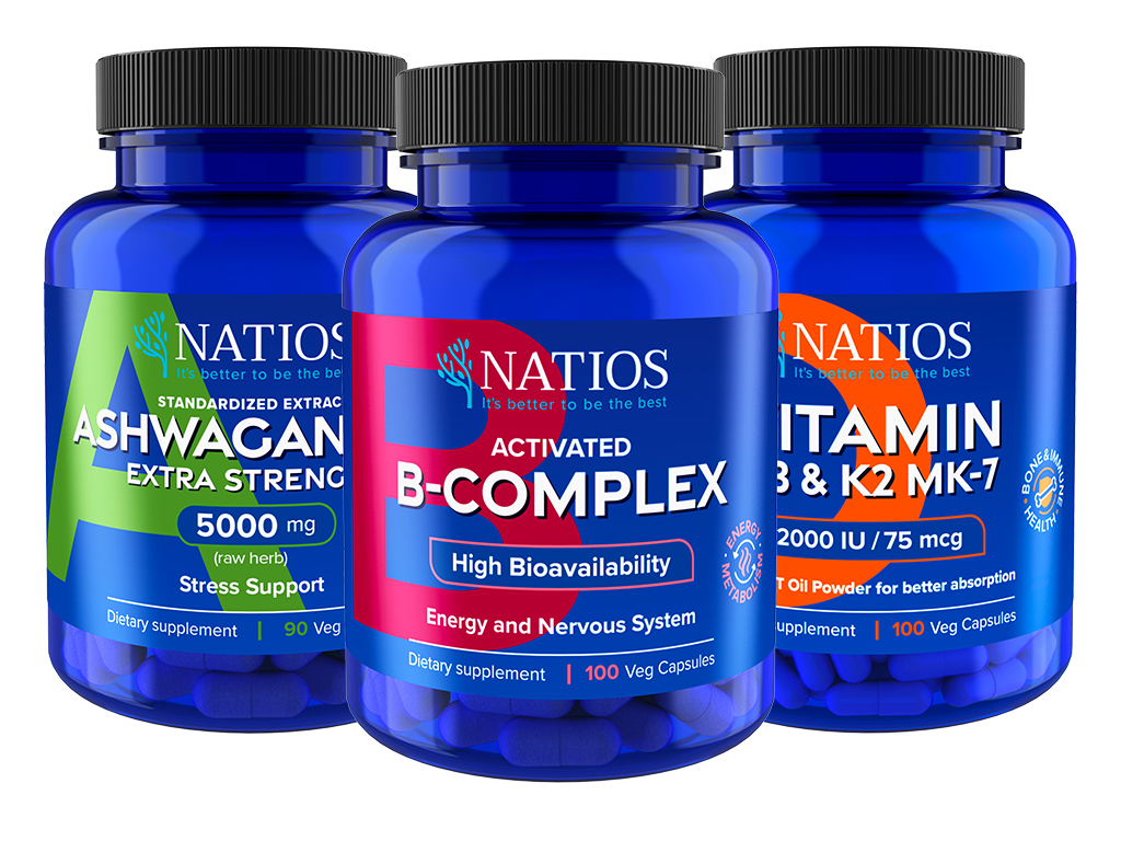 NATIOS Výhodné balení pro odolnost vůči stresu Ashwagandha, B-Complex, Vitamín D3 & K2