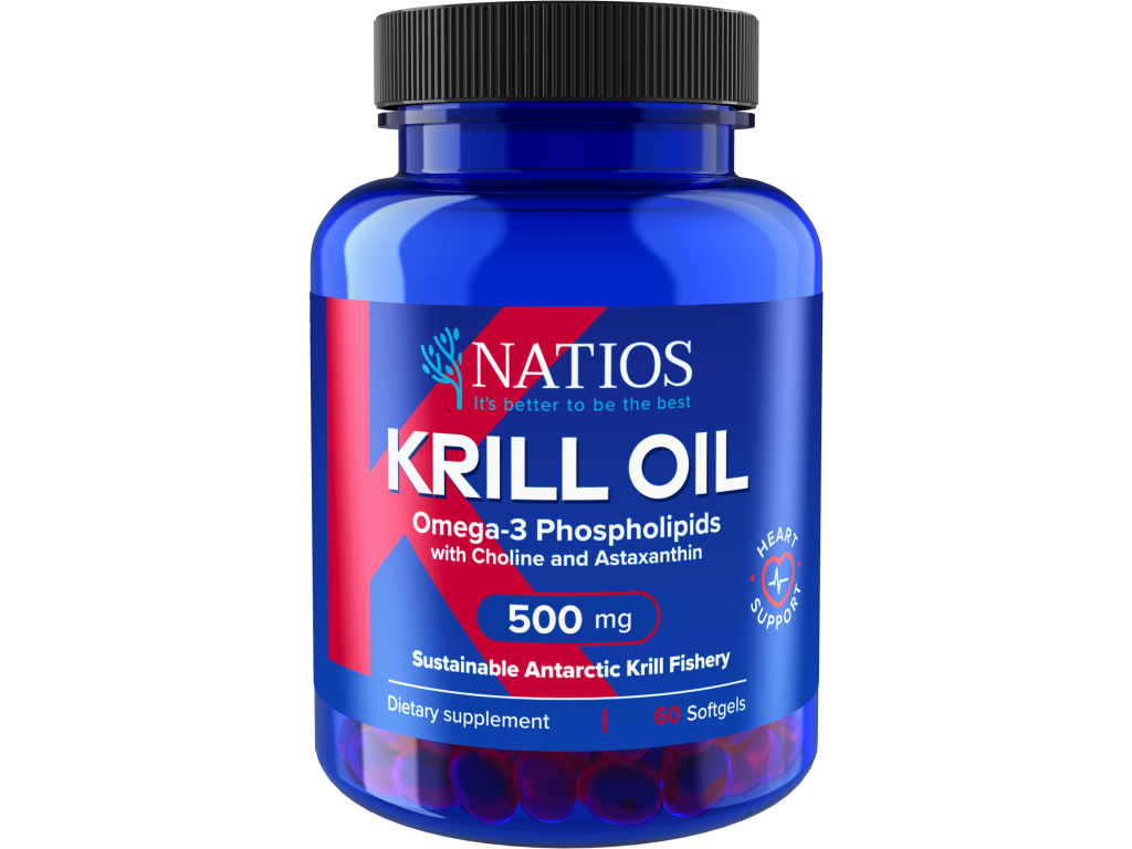 NATIOS Krill Oil – prémiový olej z antarktického krillu s obsahem omega-3 mastných kyselin (EPA a DHA) a přírodního antioxidantu astaxanthinu, cholinu a fosfolipidů. Tato vysoce vstřebatelná forma přispívá k dlouhodobé vitalitě a je vhodná pro každodenní péči o zdraví srdce.