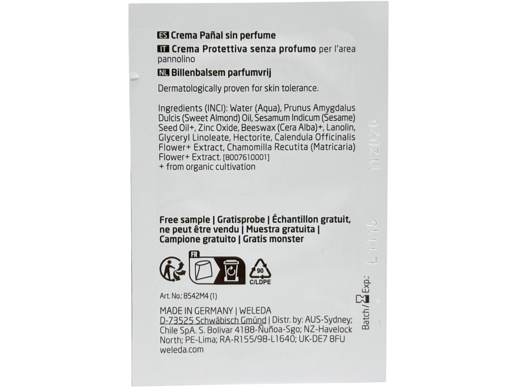INCI: Water (Aqua), Prunus Amygdalus Dulcis (Sweet Almond) Oil, Sesamum Indicum (Sesame) Seed Oil*, Zinc Oxide, Beeswax (Cera Alba)*, Lanolin, Glyceryl Linoleate, Hectorite, Calendula Officinalis Flower* Extract, Chamomilla Recutita (Matricaria) Flower* Extract. [8007610001]